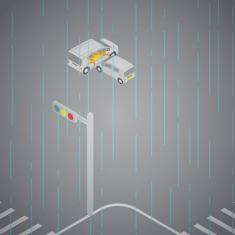 ・イラストに使用している各要素(車、背景、車、天候、信号、衝突地点など)は、代表的なイメージをイラスト化しており、色や形状等含め現実の事故の状況とは異なります。あくまで、事故のイメージとして参考までにご活用ください。