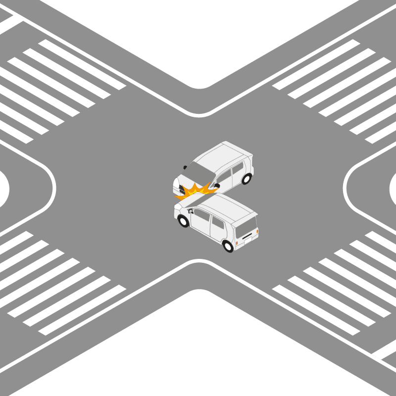 ・イラストに使用している各要素(車、背景、車、天候、信号、衝突地点など)は、代表的なイメージをイラスト化しており、色や形状等含め現実の事故の状況とは異なります。あくまで、事故のイメージとして参考までにご活用ください。