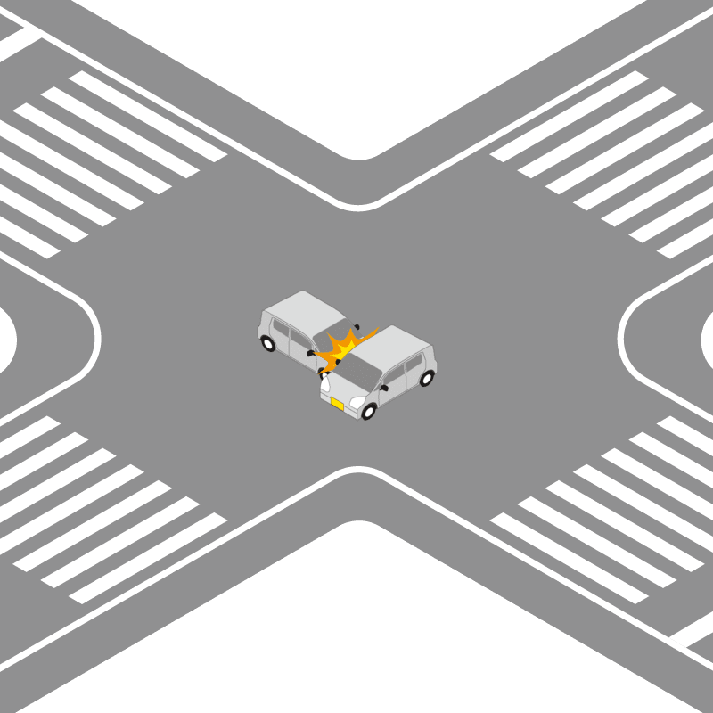 ・イラストに使用している各要素(車、背景、車、天候、信号、衝突地点など)は、代表的なイメージをイラスト化しており、色や形状等含め現実の事故の状況とは異なります。あくまで、事故のイメージとして参考までにご活用ください。