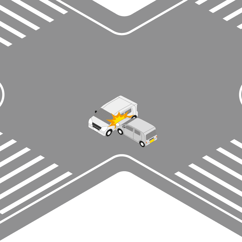 ・イラストに使用している各要素(車、背景、車、天候、信号、衝突地点など)は、代表的なイメージをイラスト化しており、色や形状等含め現実の事故の状況とは異なります。あくまで、事故のイメージとして参考までにご活用ください。