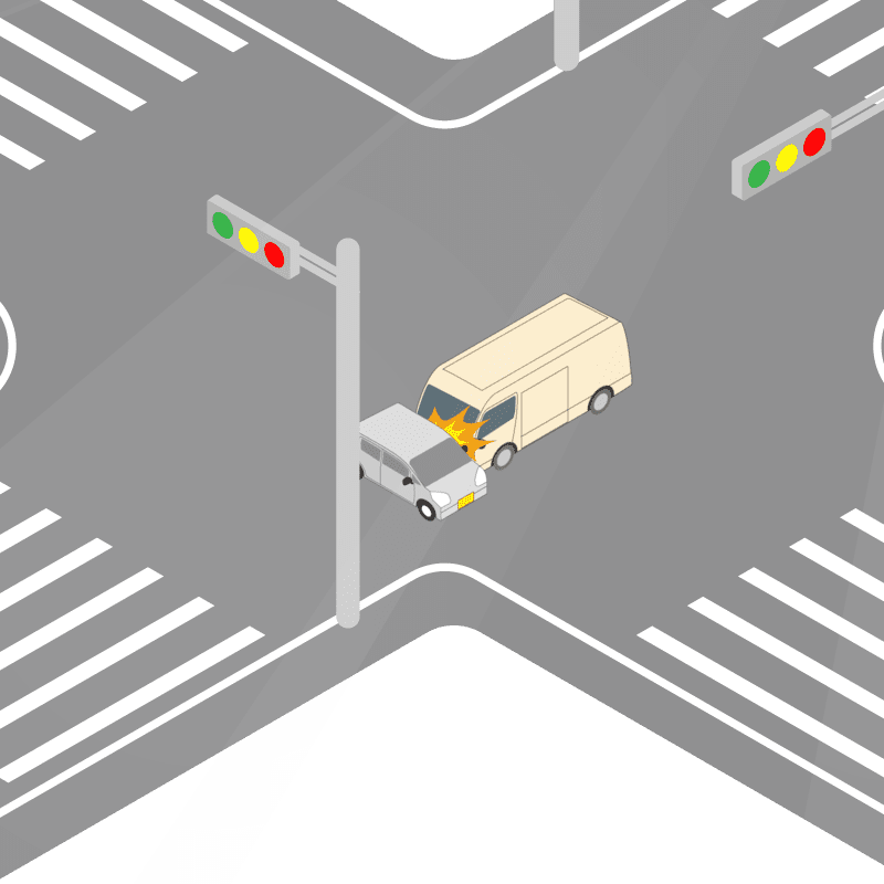 ・イラストに使用している各要素(車、背景、車、天候、信号、衝突地点など)は、代表的なイメージをイラスト化しており、色や形状等含め現実の事故の状況とは異なります。あくまで、事故のイメージとして参考までにご活用ください。