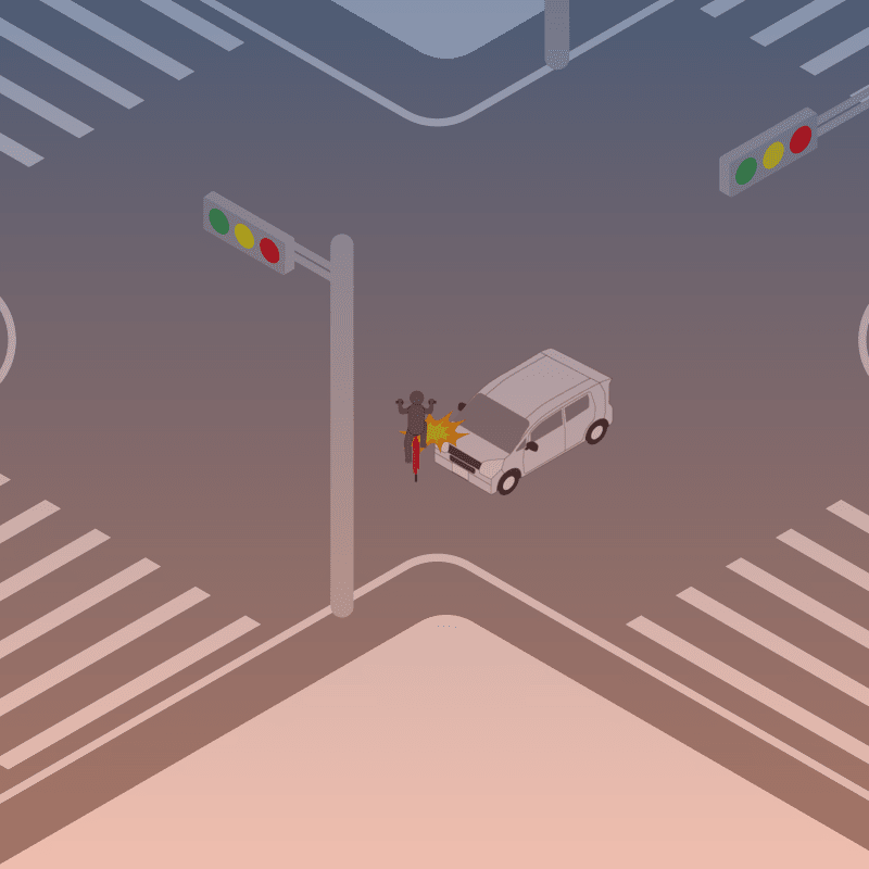 ・イラストに使用している各要素(車、背景、車、天候、信号、衝突地点など)は、代表的なイメージをイラスト化しており、色や形状等含め現実の事故の状況とは異なります。あくまで、事故のイメージとして参考までにご活用ください。