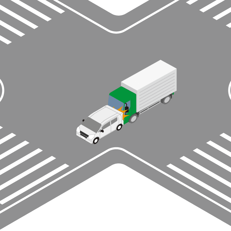 ・イラストに使用している各要素(車、背景、車、天候、信号、衝突地点など)は、代表的なイメージをイラスト化しており、色や形状等含め現実の事故の状況とは異なります。あくまで、事故のイメージとして参考までにご活用ください。