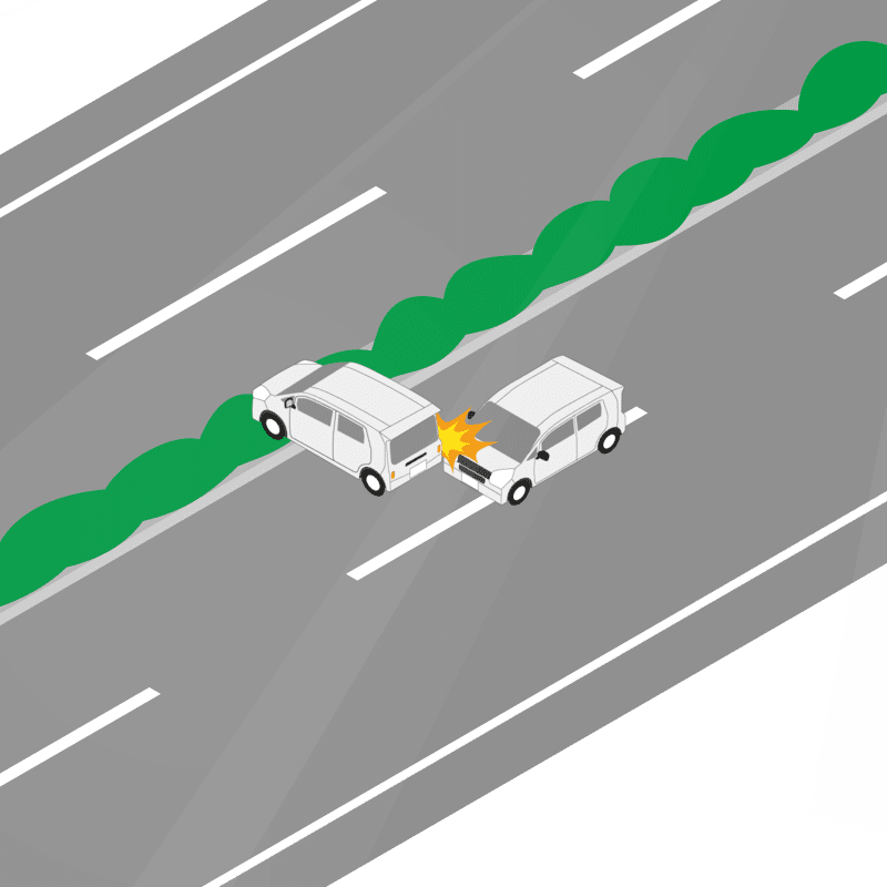 ・イラストに使用している各要素(車、背景、車、天候、信号、衝突地点など)は、代表的なイメージをイラスト化しており、色や形状等含め現実の事故の状況とは異なります。あくまで、事故のイメージとして参考までにご活用ください。