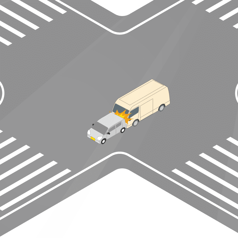 ・イラストに使用している各要素(車、背景、車、天候、信号、衝突地点など)は、代表的なイメージをイラスト化しており、色や形状等含め現実の事故の状況とは異なります。あくまで、事故のイメージとして参考までにご活用ください。