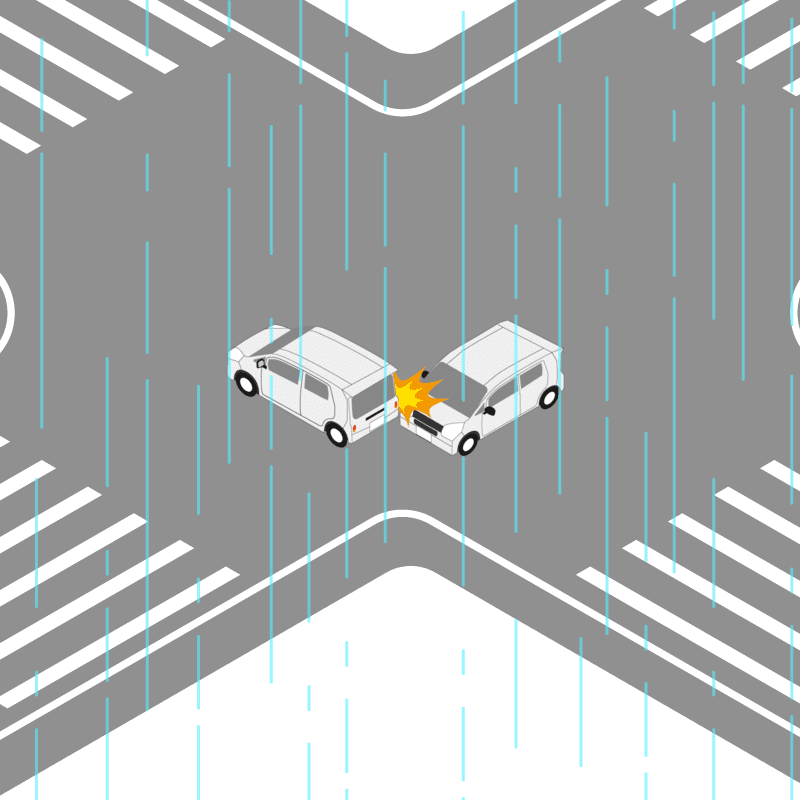 ・イラストに使用している各要素(車、背景、車、天候、信号、衝突地点など)は、代表的なイメージをイラスト化しており、色や形状等含め現実の事故の状況とは異なります。あくまで、事故のイメージとして参考までにご活用ください。