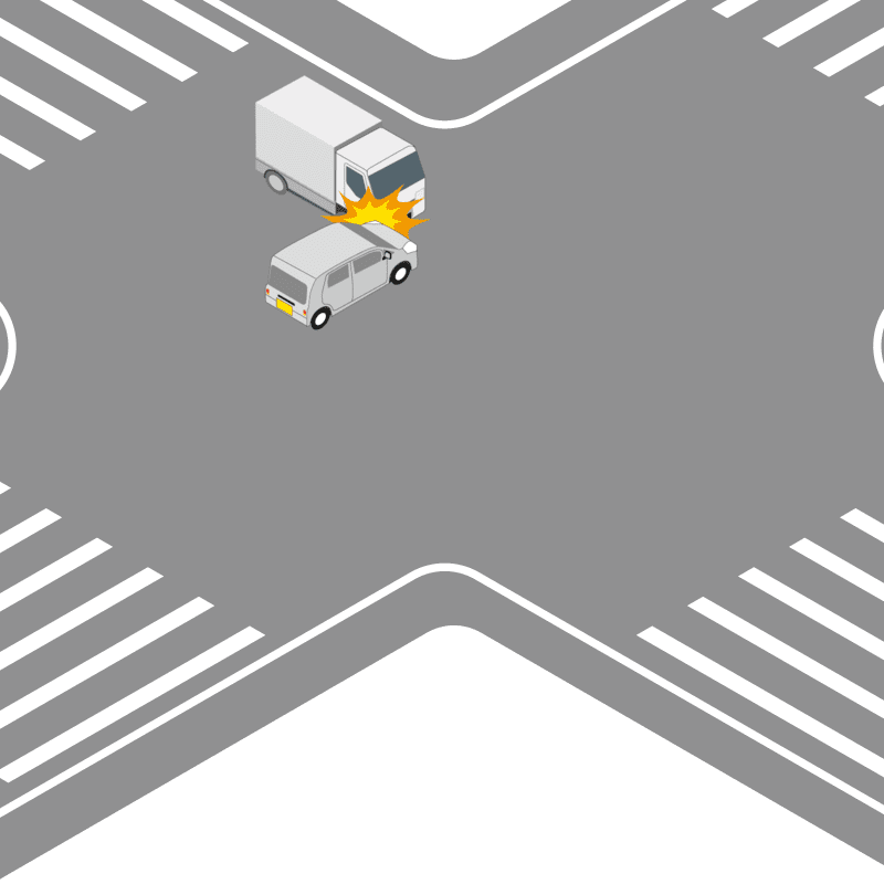 ・イラストに使用している各要素(車、背景、車、天候、信号、衝突地点など)は、代表的なイメージをイラスト化しており、色や形状等含め現実の事故の状況とは異なります。あくまで、事故のイメージとして参考までにご活用ください。