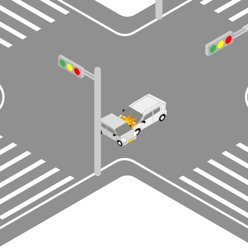 ・イラストに使用している各要素(車、背景、車、天候、信号、衝突地点など)は、代表的なイメージをイラスト化しており、色や形状等含め現実の事故の状況とは異なります。あくまで、事故のイメージとして参考までにご活用ください。
