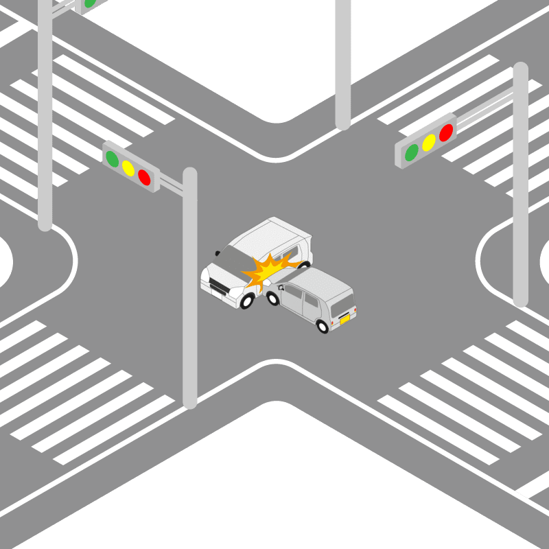 ・イラストに使用している各要素(車、背景、車、天候、信号、衝突地点など)は、代表的なイメージをイラスト化しており、色や形状等含め現実の事故の状況とは異なります。あくまで、事故のイメージとして参考までにご活用ください。