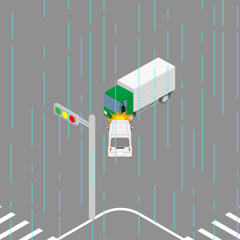 ・イラストに使用している各要素(車、背景、車、天候、信号、衝突地点など)は、代表的なイメージをイラスト化しており、色や形状等含め現実の事故の状況とは異なります。あくまで、事故のイメージとして参考までにご活用ください。