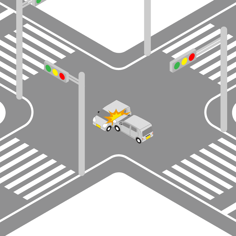 ・イラストに使用している各要素(車、背景、車、天候、信号、衝突地点など)は、代表的なイメージをイラスト化しており、色や形状等含め現実の事故の状況とは異なります。あくまで、事故のイメージとして参考までにご活用ください。
