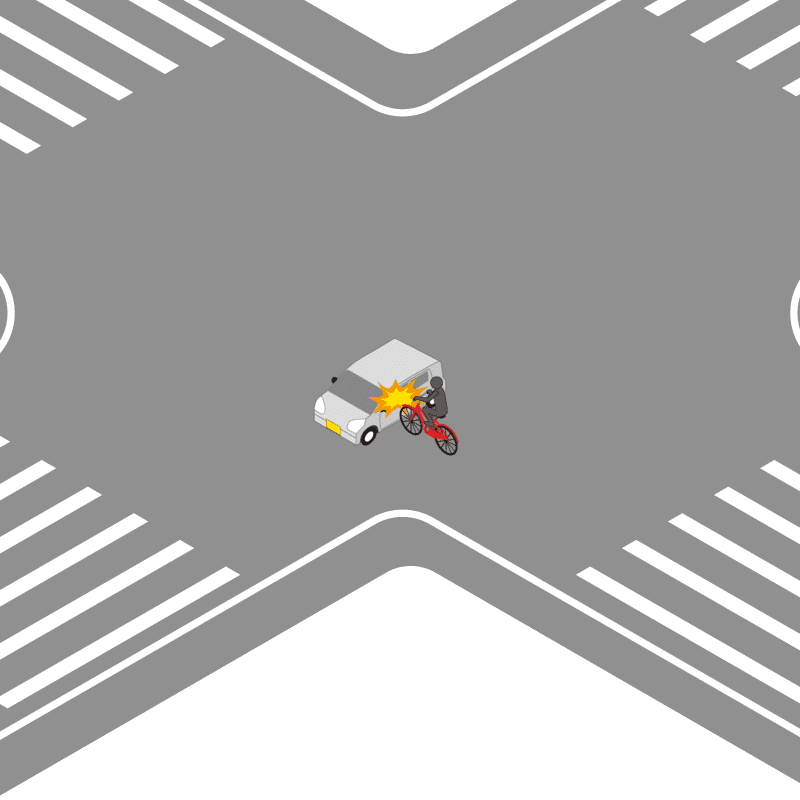 ・イラストに使用している各要素(車、背景、車、天候、信号、衝突地点など)は、代表的なイメージをイラスト化しており、色や形状等含め現実の事故の状況とは異なります。あくまで、事故のイメージとして参考までにご活用ください。