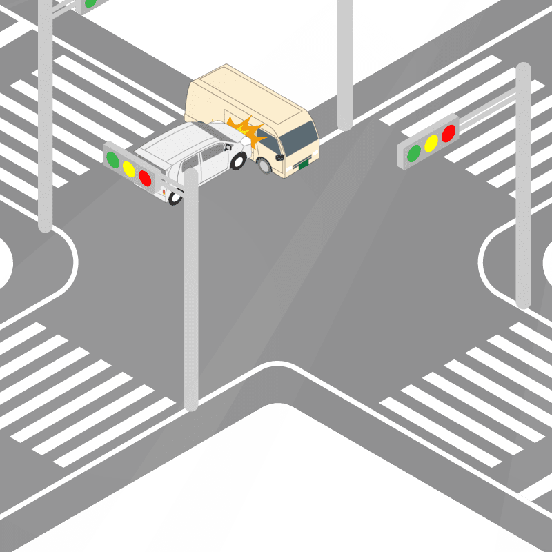 ・イラストに使用している各要素(車、背景、車、天候、信号、衝突地点など)は、代表的なイメージをイラスト化しており、色や形状等含め現実の事故の状況とは異なります。あくまで、事故のイメージとして参考までにご活用ください。