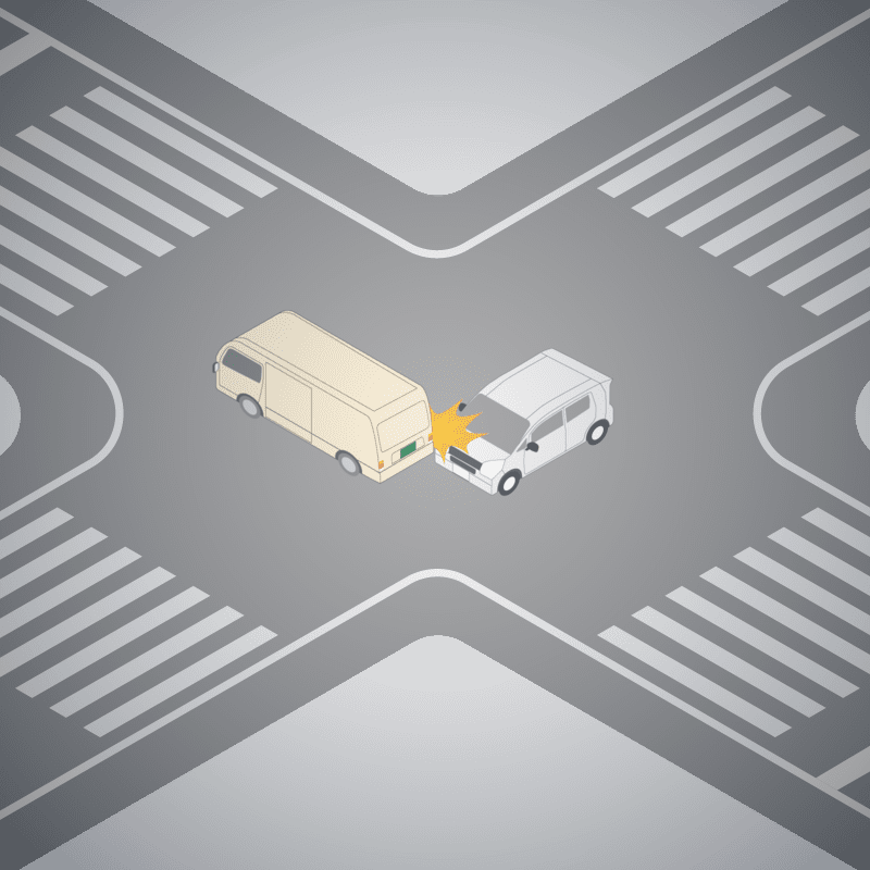 ・イラストに使用している各要素(車、背景、車、天候、信号、衝突地点など)は、代表的なイメージをイラスト化しており、色や形状等含め現実の事故の状況とは異なります。あくまで、事故のイメージとして参考までにご活用ください。
