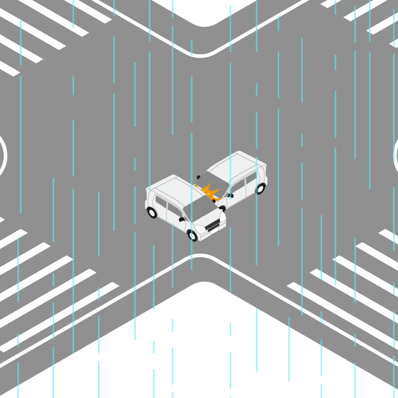 ・イラストに使用している各要素(車、背景、車、天候、信号、衝突地点など)は、代表的なイメージをイラスト化しており、色や形状等含め現実の事故の状況とは異なります。あくまで、事故のイメージとして参考までにご活用ください。