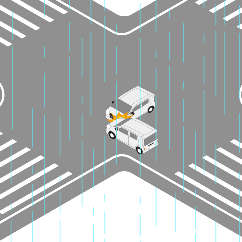・イラストに使用している各要素(車、背景、車、天候、信号、衝突地点など)は、代表的なイメージをイラスト化しており、色や形状等含め現実の事故の状況とは異なります。あくまで、事故のイメージとして参考までにご活用ください。