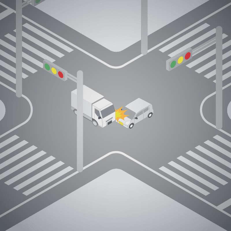 ・イラストに使用している各要素(車、背景、車、天候、信号、衝突地点など)は、代表的なイメージをイラスト化しており、色や形状等含め現実の事故の状況とは異なります。あくまで、事故のイメージとして参考までにご活用ください。