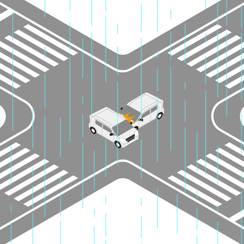 ・イラストに使用している各要素(車、背景、車、天候、信号、衝突地点など)は、代表的なイメージをイラスト化しており、色や形状等含め現実の事故の状況とは異なります。あくまで、事故のイメージとして参考までにご活用ください。