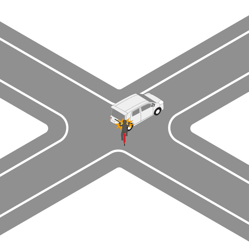 ・イラストに使用している各要素(車、背景、車、天候、信号、衝突地点など)は、代表的なイメージをイラスト化しており、色や形状等含め現実の事故の状況とは異なります。あくまで、事故のイメージとして参考までにご活用ください。