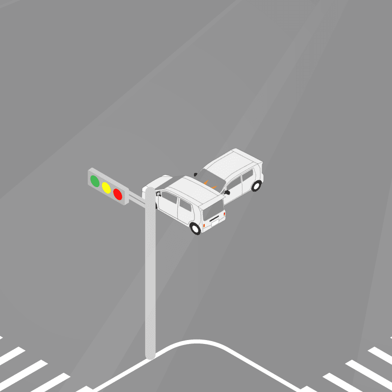 ・イラストに使用している各要素(車、背景、車、天候、信号、衝突地点など)は、代表的なイメージをイラスト化しており、色や形状等含め現実の事故の状況とは異なります。あくまで、事故のイメージとして参考までにご活用ください。