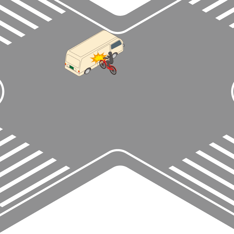 ・イラストに使用している各要素(車、背景、車、天候、信号、衝突地点など)は、代表的なイメージをイラスト化しており、色や形状等含め現実の事故の状況とは異なります。あくまで、事故のイメージとして参考までにご活用ください。
