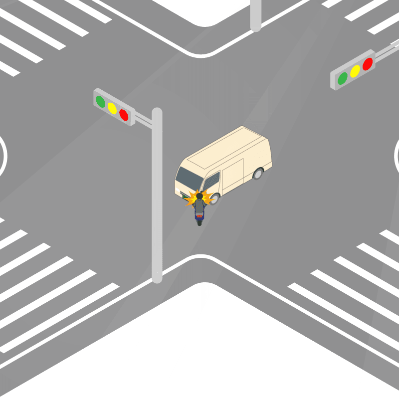 ・イラストに使用している各要素(車、背景、車、天候、信号、衝突地点など)は、代表的なイメージをイラスト化しており、色や形状等含め現実の事故の状況とは異なります。あくまで、事故のイメージとして参考までにご活用ください。
