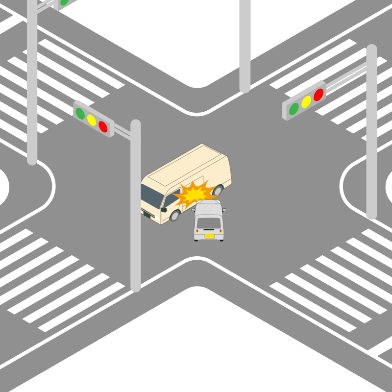 ・イラストに使用している各要素(車、背景、車、天候、信号、衝突地点など)は、代表的なイメージをイラスト化しており、色や形状等含め現実の事故の状況とは異なります。あくまで、事故のイメージとして参考までにご活用ください。