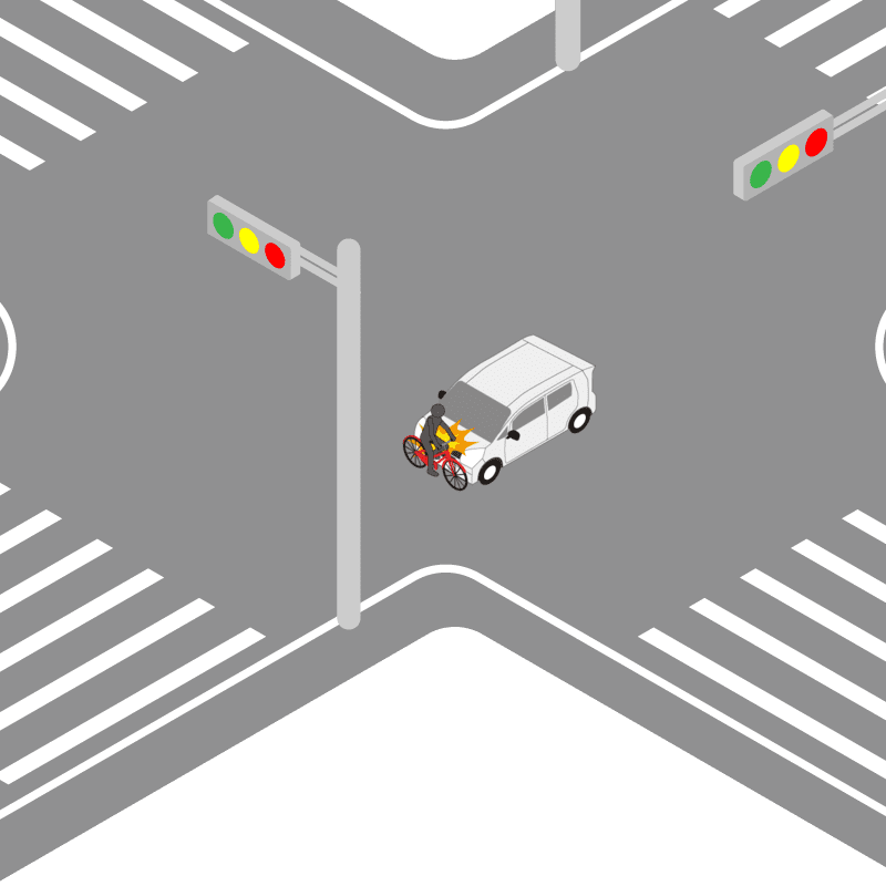 ・イラストに使用している各要素(車、背景、車、天候、信号、衝突地点など)は、代表的なイメージをイラスト化しており、色や形状等含め現実の事故の状況とは異なります。あくまで、事故のイメージとして参考までにご活用ください。