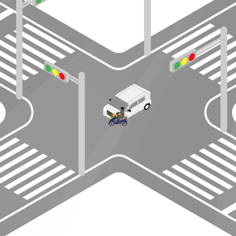 ・イラストに使用している各要素(車、背景、車、天候、信号、衝突地点など)は、代表的なイメージをイラスト化しており、色や形状等含め現実の事故の状況とは異なります。あくまで、事故のイメージとして参考までにご活用ください。