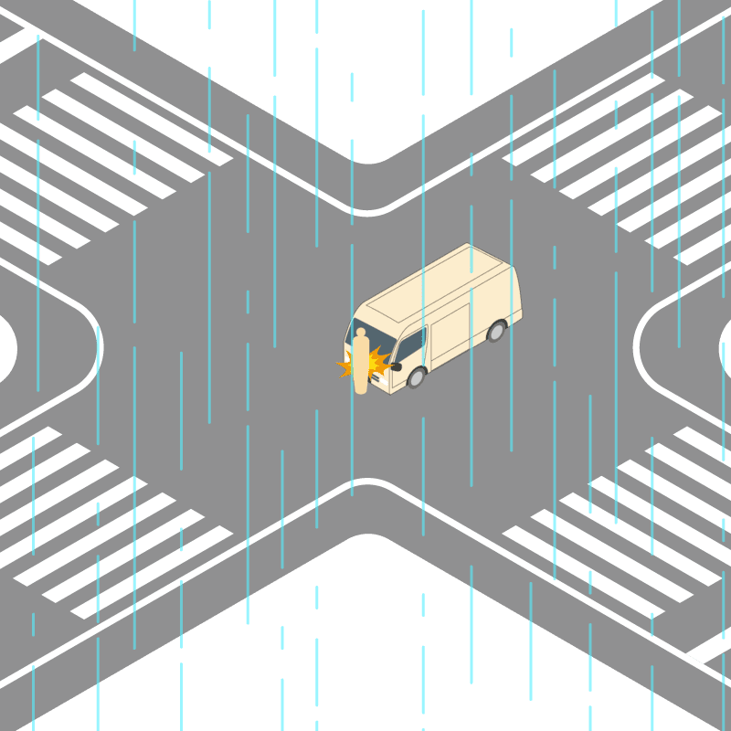 ・イラストに使用している各要素(車、背景、車、天候、信号、衝突地点など)は、代表的なイメージをイラスト化しており、色や形状等含め現実の事故の状況とは異なります。あくまで、事故のイメージとして参考までにご活用ください。