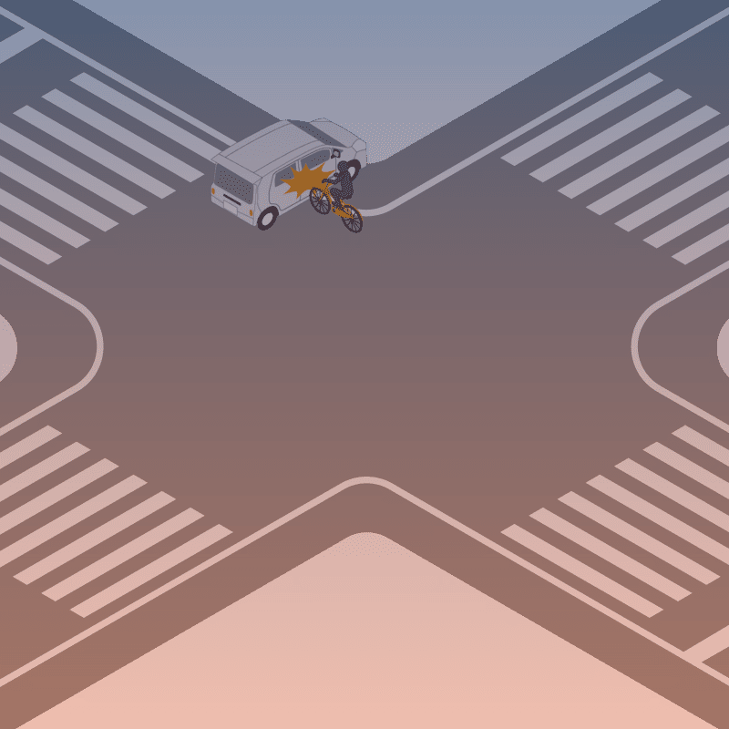 ・イラストに使用している各要素(車、背景、車、天候、信号、衝突地点など)は、代表的なイメージをイラスト化しており、色や形状等含め現実の事故の状況とは異なります。あくまで、事故のイメージとして参考までにご活用ください。