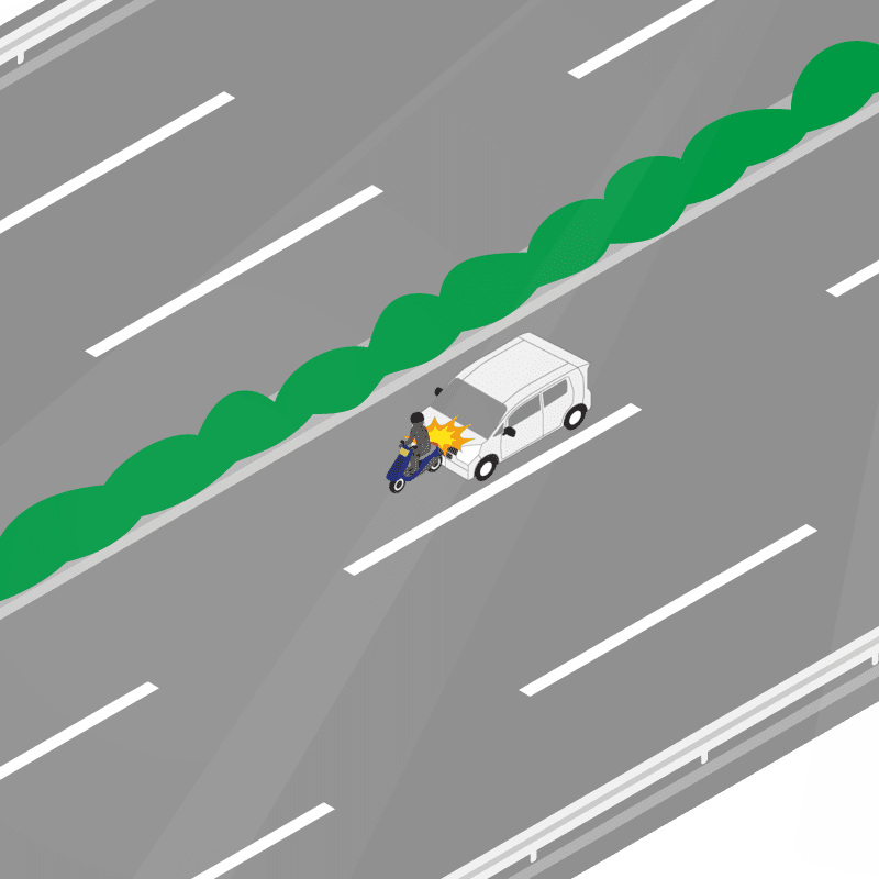 ・イラストに使用している各要素(車、背景、車、天候、信号、衝突地点など)は、代表的なイメージをイラスト化しており、色や形状等含め現実の事故の状況とは異なります。あくまで、事故のイメージとして参考までにご活用ください。