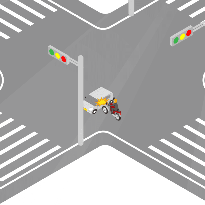 ・イラストに使用している各要素(車、背景、車、天候、信号、衝突地点など)は、代表的なイメージをイラスト化しており、色や形状等含め現実の事故の状況とは異なります。あくまで、事故のイメージとして参考までにご活用ください。