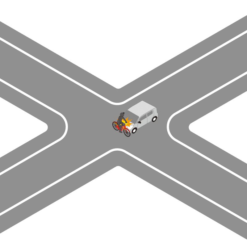 ・イラストに使用している各要素(車、背景、車、天候、信号、衝突地点など)は、代表的なイメージをイラスト化しており、色や形状等含め現実の事故の状況とは異なります。あくまで、事故のイメージとして参考までにご活用ください。