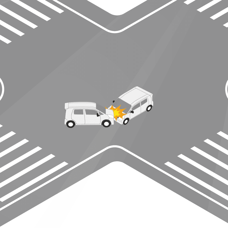 ・イラストに使用している各要素(車、背景、車、天候、信号、衝突地点など)は、代表的なイメージをイラスト化しており、色や形状等含め現実の事故の状況とは異なります。あくまで、事故のイメージとして参考までにご活用ください。