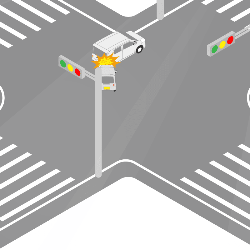 ・イラストに使用している各要素(車、背景、車、天候、信号、衝突地点など)は、代表的なイメージをイラスト化しており、色や形状等含め現実の事故の状況とは異なります。あくまで、事故のイメージとして参考までにご活用ください。