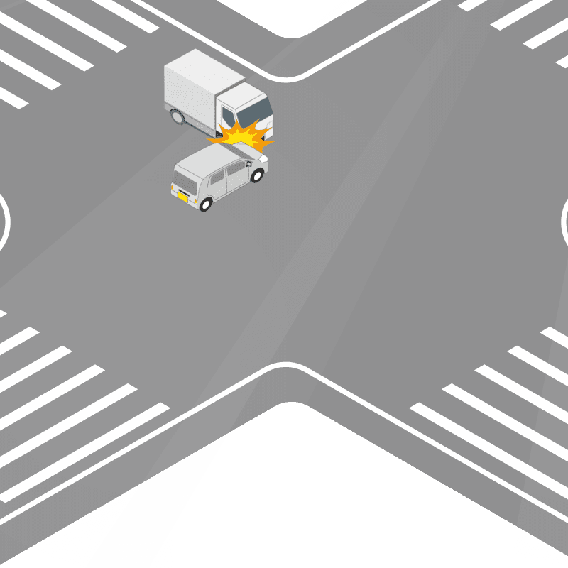 ・イラストに使用している各要素(車、背景、車、天候、信号、衝突地点など)は、代表的なイメージをイラスト化しており、色や形状等含め現実の事故の状況とは異なります。あくまで、事故のイメージとして参考までにご活用ください。