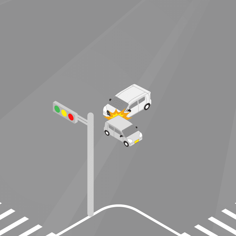 ・イラストに使用している各要素(車、背景、車、天候、信号、衝突地点など)は、代表的なイメージをイラスト化しており、色や形状等含め現実の事故の状況とは異なります。あくまで、事故のイメージとして参考までにご活用ください。