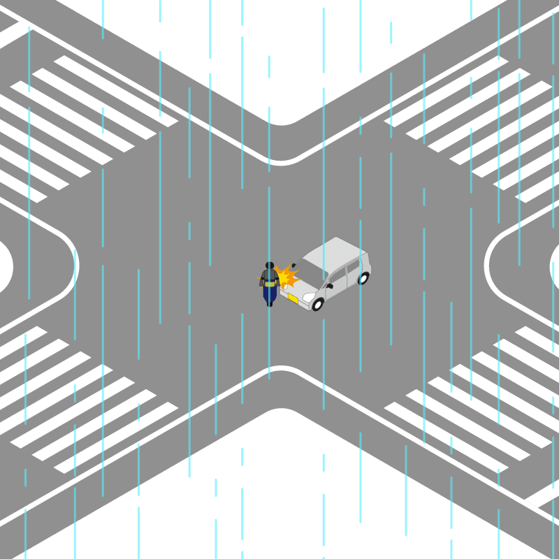 ・イラストに使用している各要素(車、背景、車、天候、信号、衝突地点など)は、代表的なイメージをイラスト化しており、色や形状等含め現実の事故の状況とは異なります。あくまで、事故のイメージとして参考までにご活用ください。