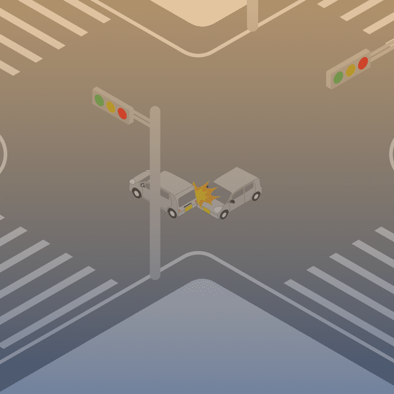 ・イラストに使用している各要素(車、背景、車、天候、信号、衝突地点など)は、代表的なイメージをイラスト化しており、色や形状等含め現実の事故の状況とは異なります。あくまで、事故のイメージとして参考までにご活用ください。
