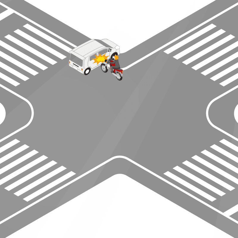 ・イラストに使用している各要素(車、背景、車、天候、信号、衝突地点など)は、代表的なイメージをイラスト化しており、色や形状等含め現実の事故の状況とは異なります。あくまで、事故のイメージとして参考までにご活用ください。