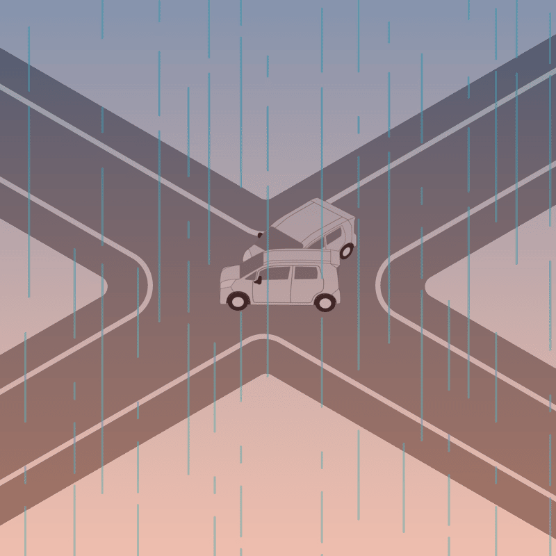 ・イラストに使用している各要素(車、背景、車、天候、信号、衝突地点など)は、代表的なイメージをイラスト化しており、色や形状等含め現実の事故の状況とは異なります。あくまで、事故のイメージとして参考までにご活用ください。