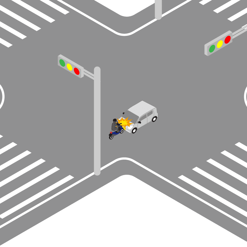 ・イラストに使用している各要素(車、背景、車、天候、信号、衝突地点など)は、代表的なイメージをイラスト化しており、色や形状等含め現実の事故の状況とは異なります。あくまで、事故のイメージとして参考までにご活用ください。