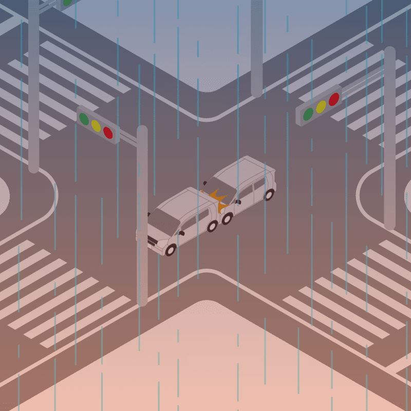 ・イラストに使用している各要素(車、背景、車、天候、信号、衝突地点など)は、代表的なイメージをイラスト化しており、色や形状等含め現実の事故の状況とは異なります。あくまで、事故のイメージとして参考までにご活用ください。