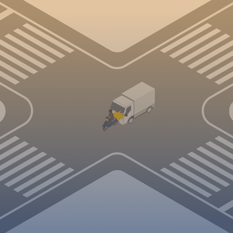 ・イラストに使用している各要素(車、背景、車、天候、信号、衝突地点など)は、代表的なイメージをイラスト化しており、色や形状等含め現実の事故の状況とは異なります。あくまで、事故のイメージとして参考までにご活用ください。