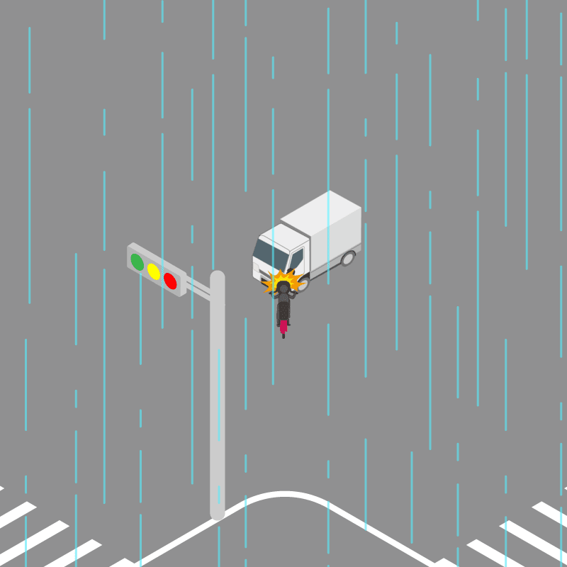 ・イラストに使用している各要素(車、背景、車、天候、信号、衝突地点など)は、代表的なイメージをイラスト化しており、色や形状等含め現実の事故の状況とは異なります。あくまで、事故のイメージとして参考までにご活用ください。