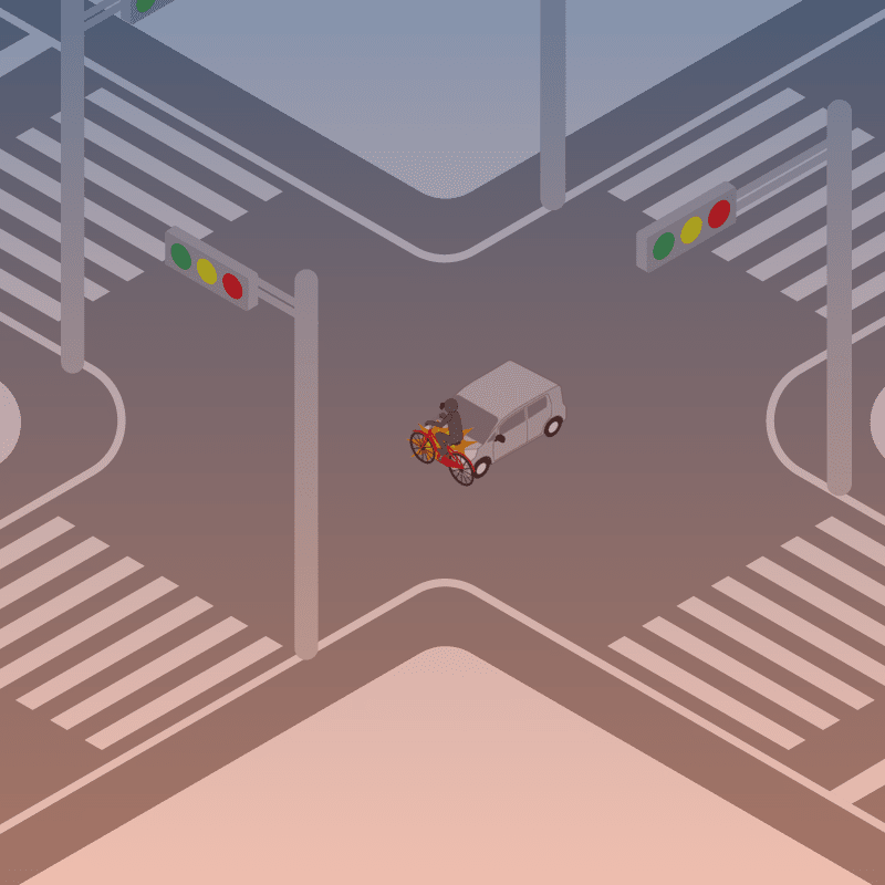 ・イラストに使用している各要素(車、背景、車、天候、信号、衝突地点など)は、代表的なイメージをイラスト化しており、色や形状等含め現実の事故の状況とは異なります。あくまで、事故のイメージとして参考までにご活用ください。