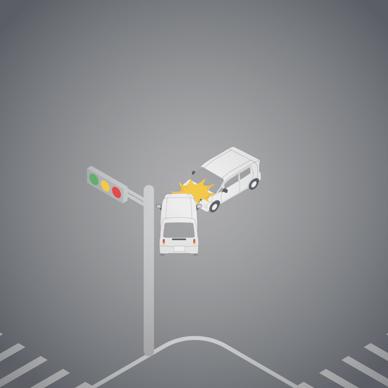 ・イラストに使用している各要素(車、背景、車、天候、信号、衝突地点など)は、代表的なイメージをイラスト化しており、色や形状等含め現実の事故の状況とは異なります。あくまで、事故のイメージとして参考までにご活用ください。