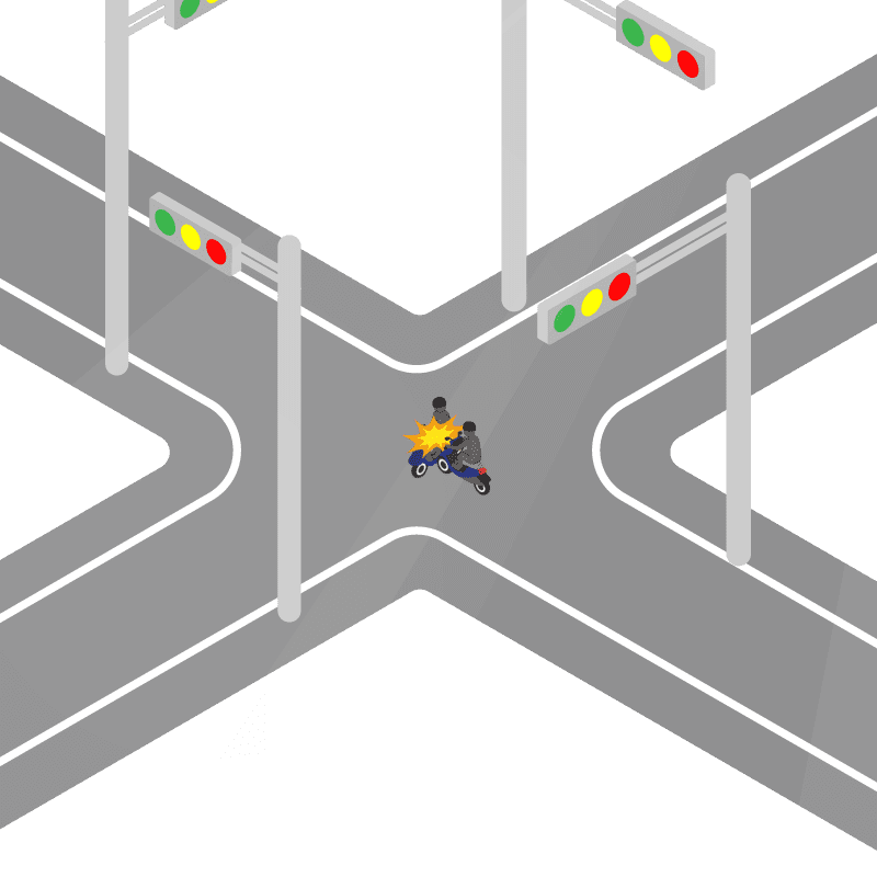・イラストに使用している各要素(車、背景、車、天候、信号、衝突地点など)は、代表的なイメージをイラスト化しており、色や形状等含め現実の事故の状況とは異なります。あくまで、事故のイメージとして参考までにご活用ください。