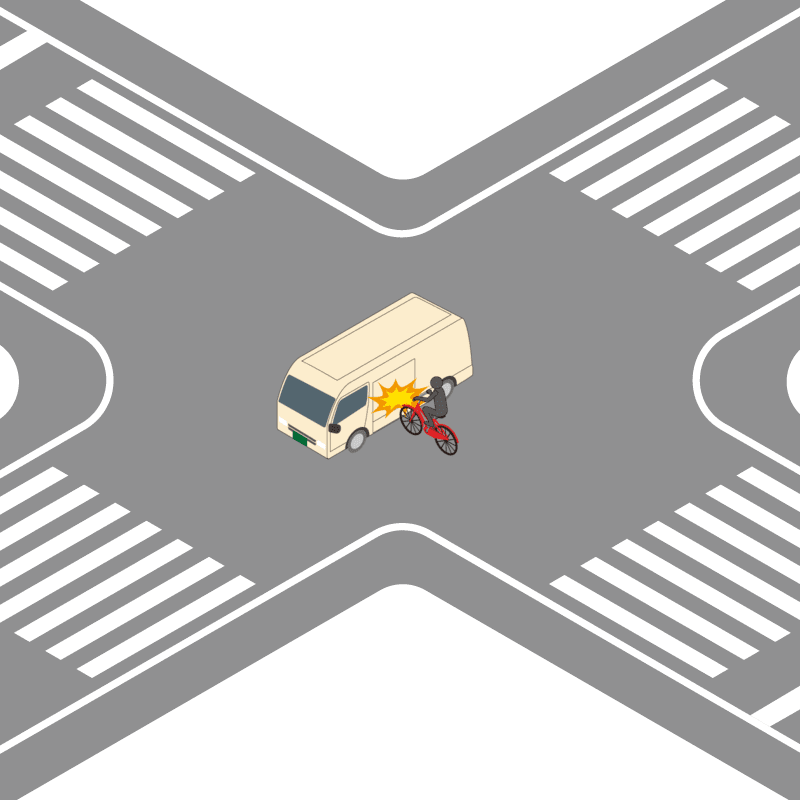 ・イラストに使用している各要素(車、背景、車、天候、信号、衝突地点など)は、代表的なイメージをイラスト化しており、色や形状等含め現実の事故の状況とは異なります。あくまで、事故のイメージとして参考までにご活用ください。